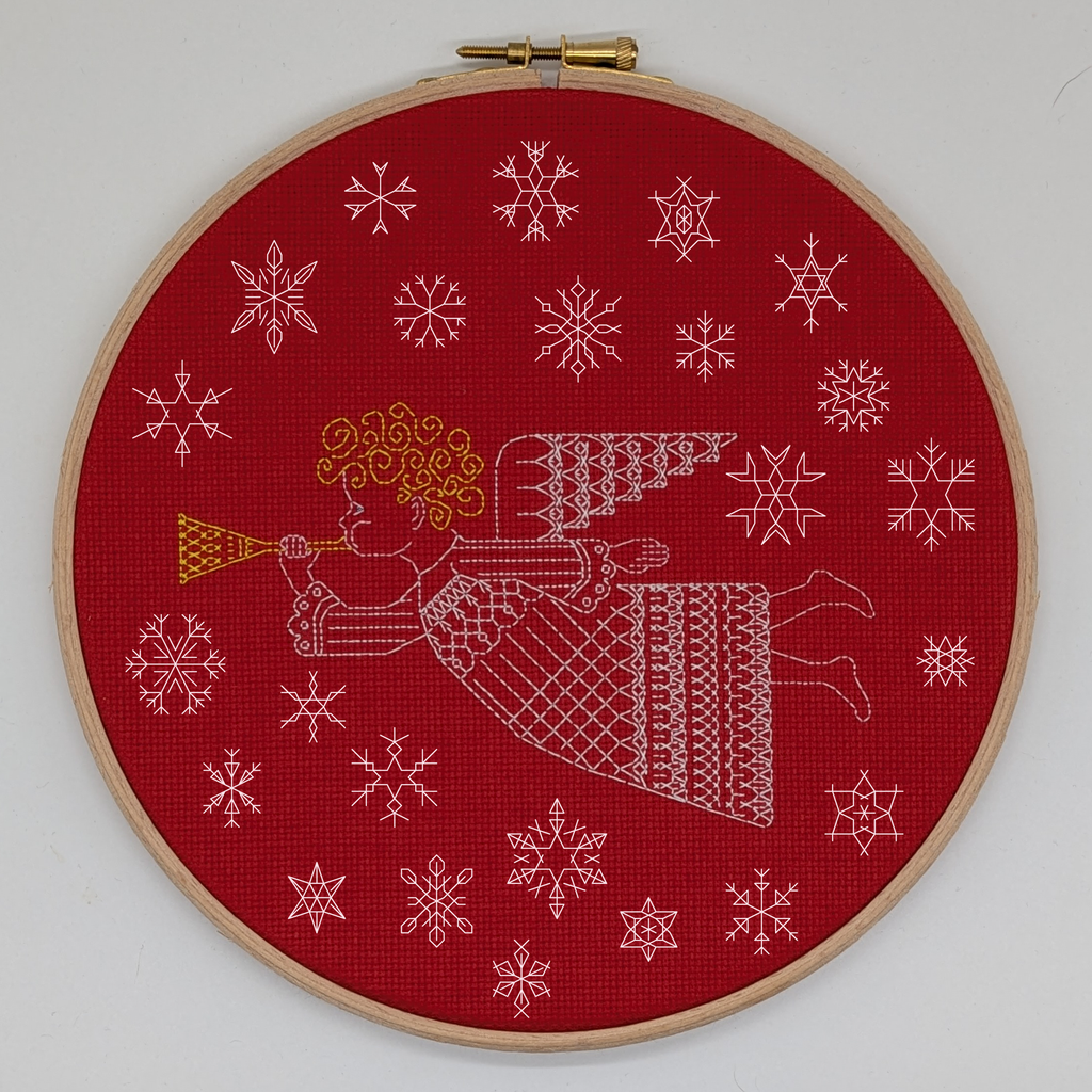 This design features a curly haired angel in a lacy gown and 24 unique little snowflakes in the surrounding sky.