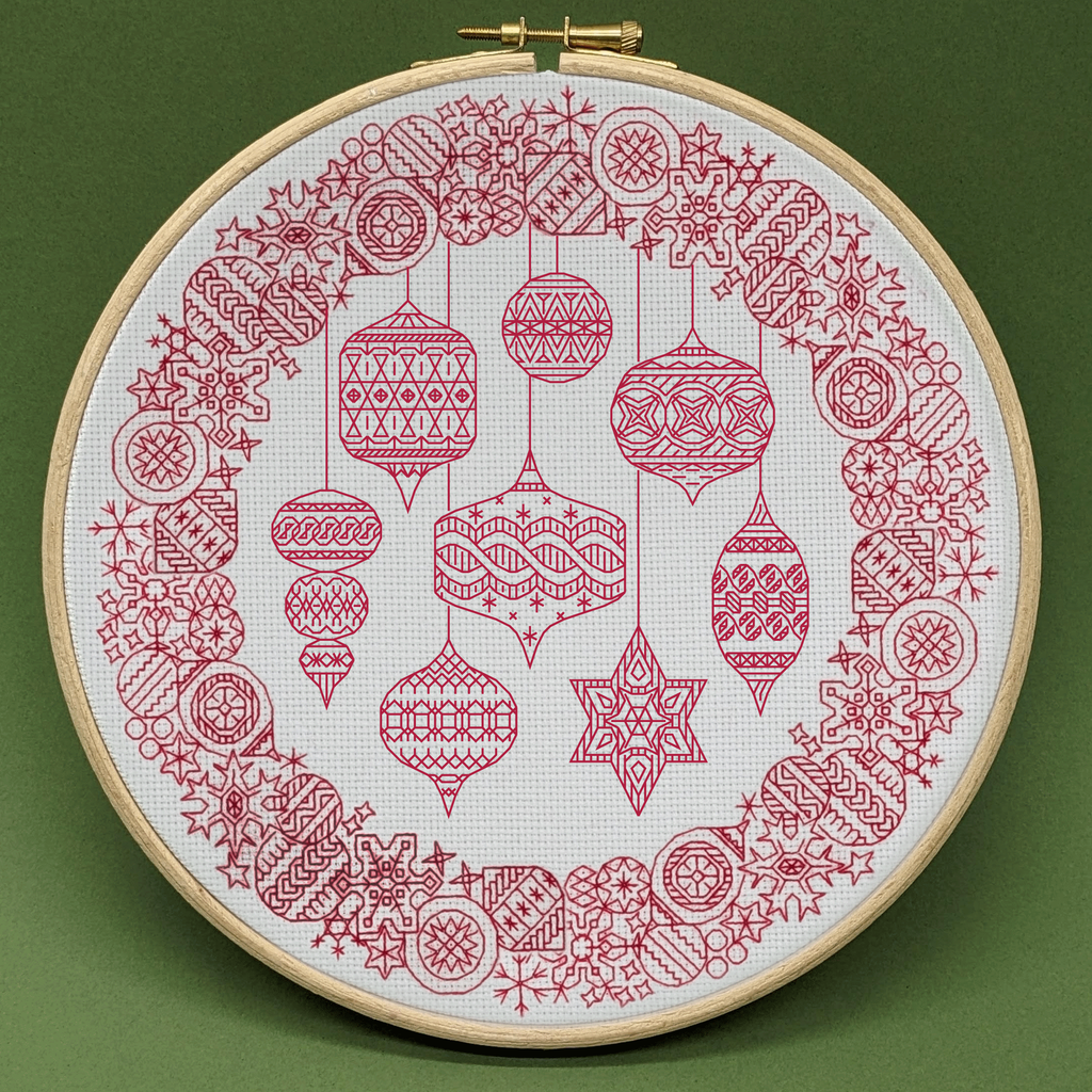 This chart was released as my 2025 Christmas charity baubles stitch-a-long (the sixth year of charity bauble SALs!) This year, there are definitely baubles galore, with this border featuring an array of shiny, festive motifs. You could stitch this one in a single colour, as I did, or go off-road with a whole smorgasbord of Christmas colors!