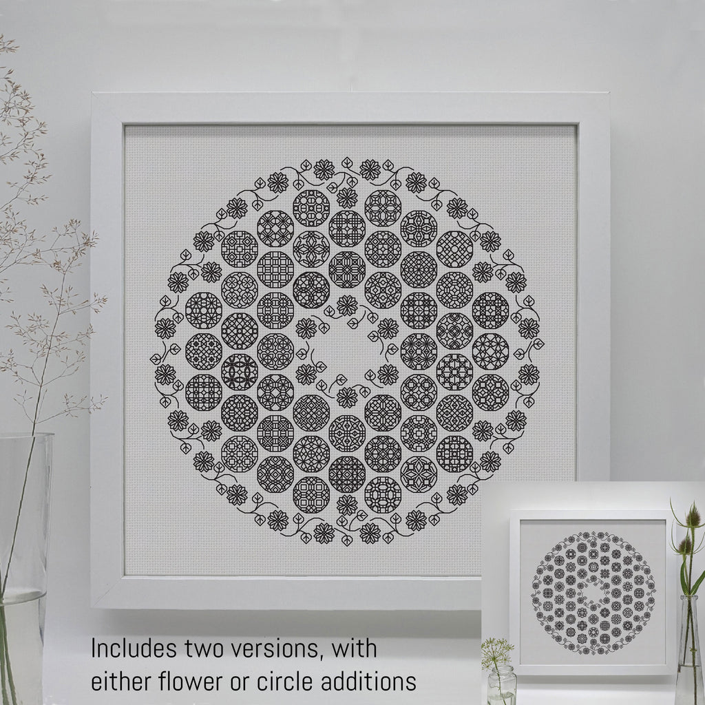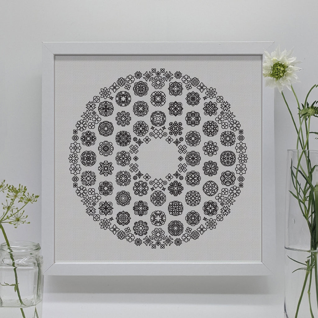 The 'Flowers and Stems' version of this 2025 stitch-a-long is released here as a completed design. The border features flowers on winding stems and you can choose to use the flower or circle additions (both are included with the chart)