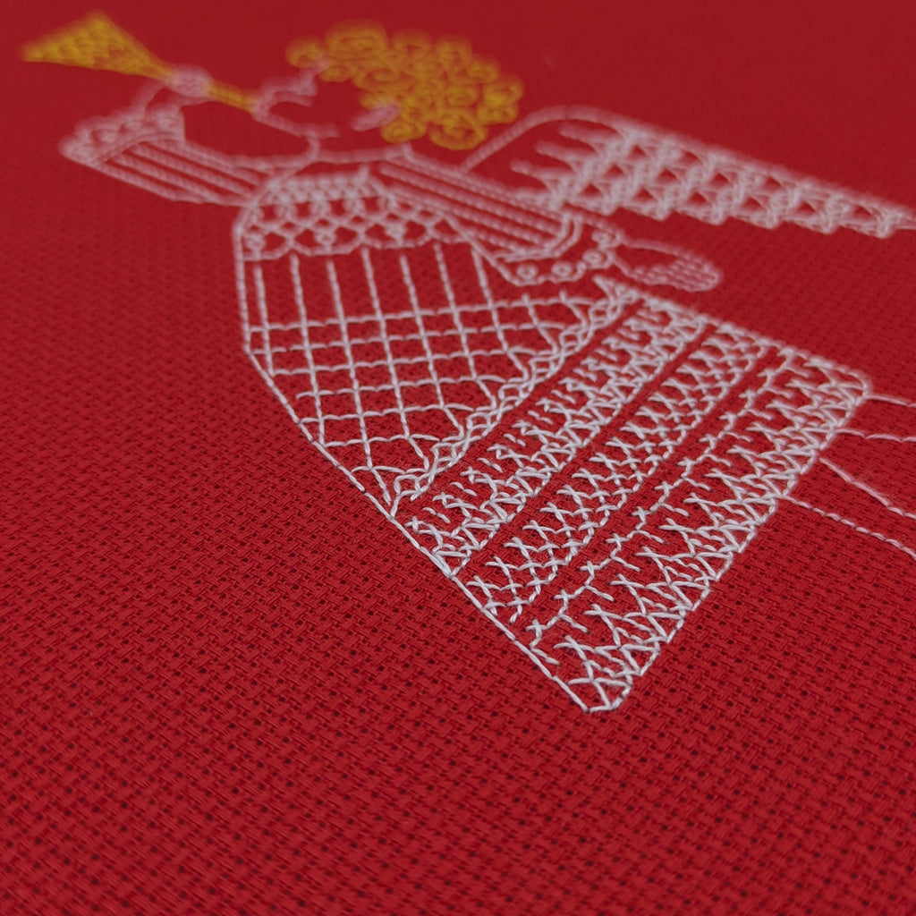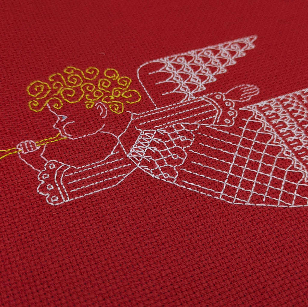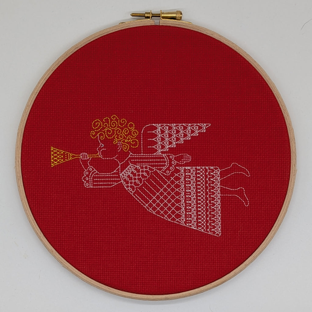 I recommend using a single strand of DMC/equivalent . I used DMC 973 (yellow) for the hair and trumpet, DMC 604 (pink) for the hands, legs and face, DMC 597 (blue) for the eye and DMC B5200 (white) for the rest, on 18 count red Zweigart (now sadly discontinued,) but you might find some/other brands are available. Of course you can stitch this design in any colourways you choose, to suit your own taste/Christmas decor!