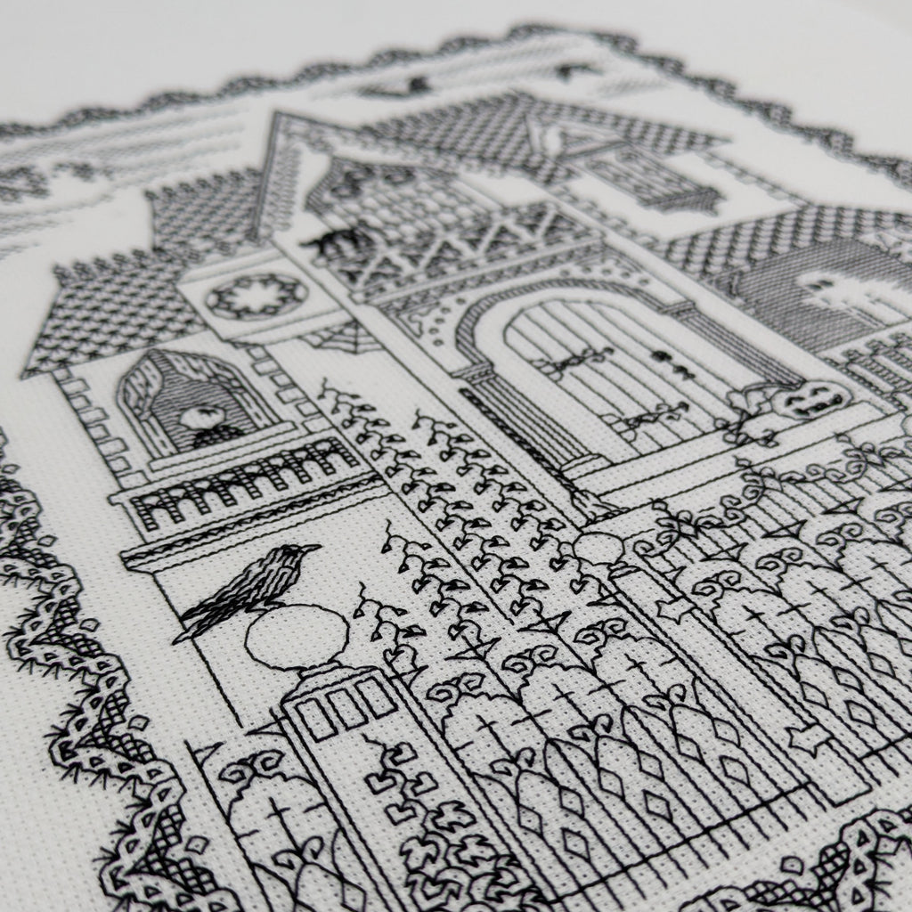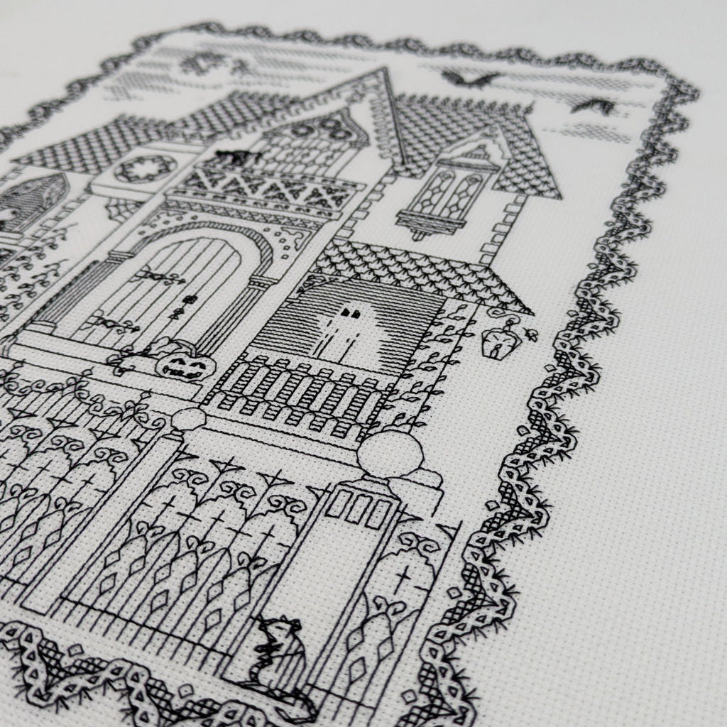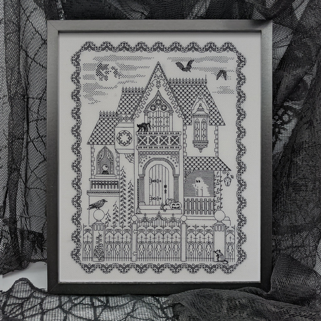 This halloweeny household was the spooky stitch-a-long for 2025. Featuring some ornate ironwork beyond which you can find a house fit for a mysterious resident.